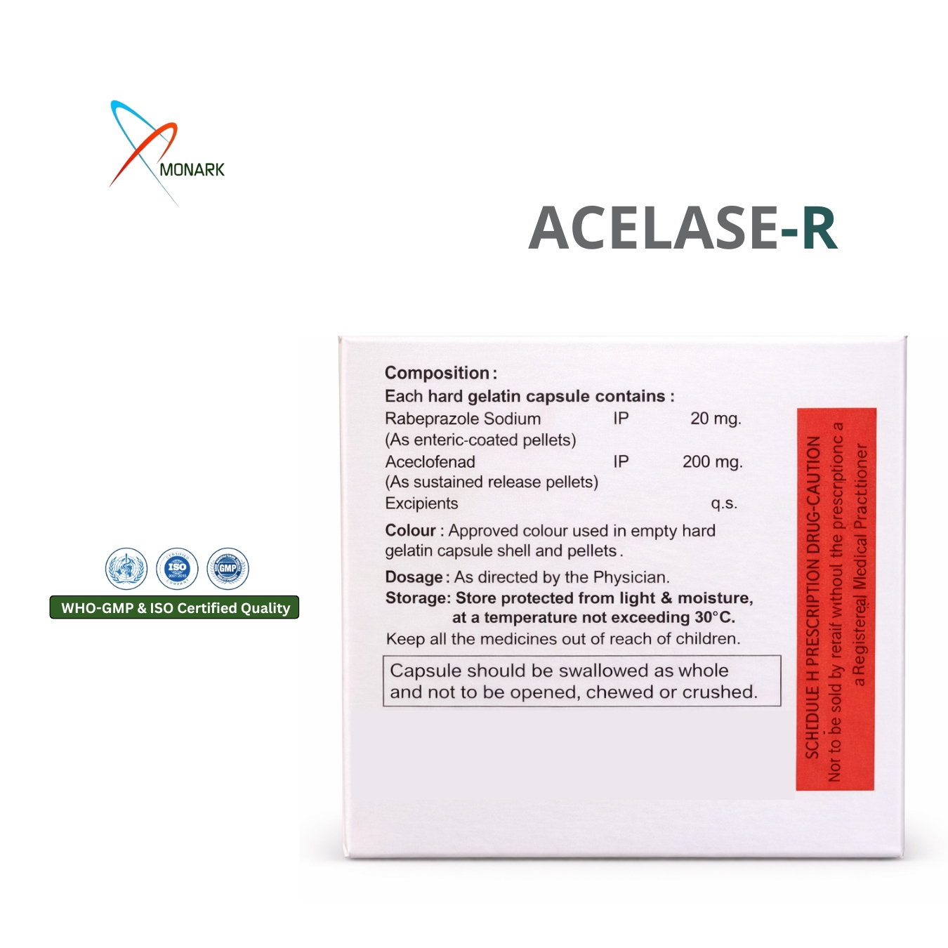 Aceclofenac & Rabeprazole capsules Company in India - Aceclofenac & Rabeprazole capsules offer a unique combination therapy that addresses both the pain and inflammation caused by conditions like arthritis and the gastrointestinal risks associated with long-term NSAID use. By combining the powerful anti-inflammatory effects of Aceclofenac with the protective stomach benefits of Rabeprazole, this medication provides a safe and effective treatment for chronic inflammatory conditions. Collaborate with Monark Biocare to get the top quality PCD Franchise for Aceclofenac Rabeprazole Capsules.