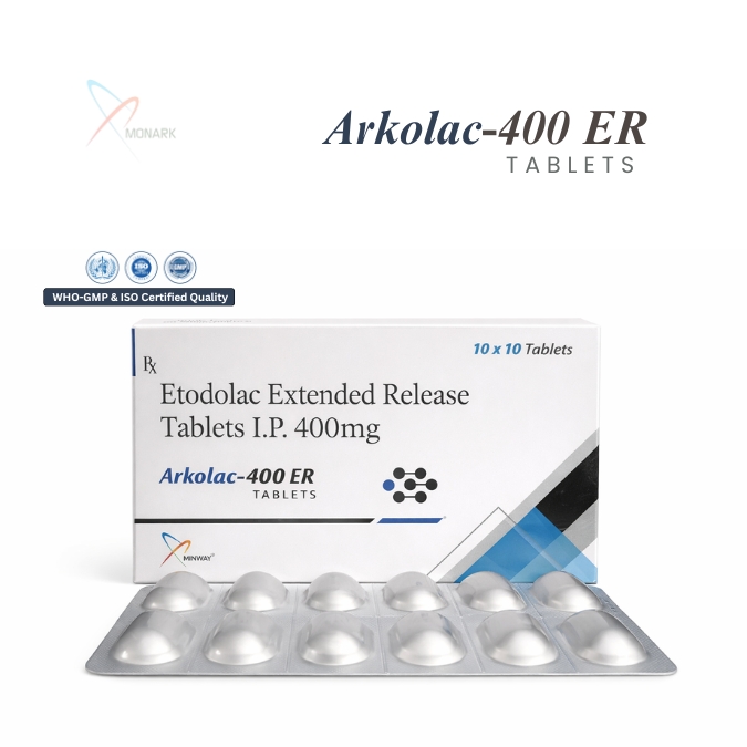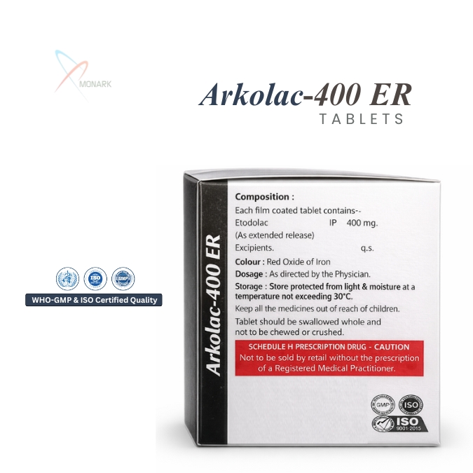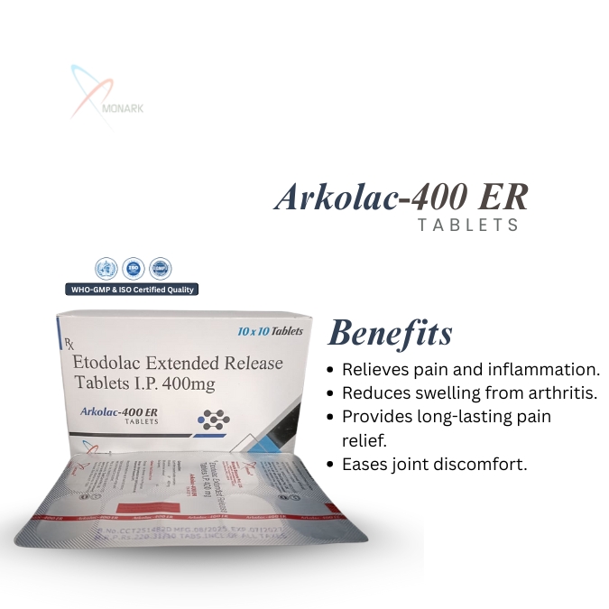 Etodolac Extended Release Tablets are nonsteroidal anti-inflammatory drugs (NSAIDs) used to manage pain, inflammation, and swelling. They are often prescribed for the treatment of chronic conditions like osteoarthritis and rheumatoid arthritis, where long-term pain management is necessary. These tablets are manufactured by various pharmaceutical companies, including Monark Biocare, and come in an extended-release formulation, allowing for prolonged action with fewer doses.