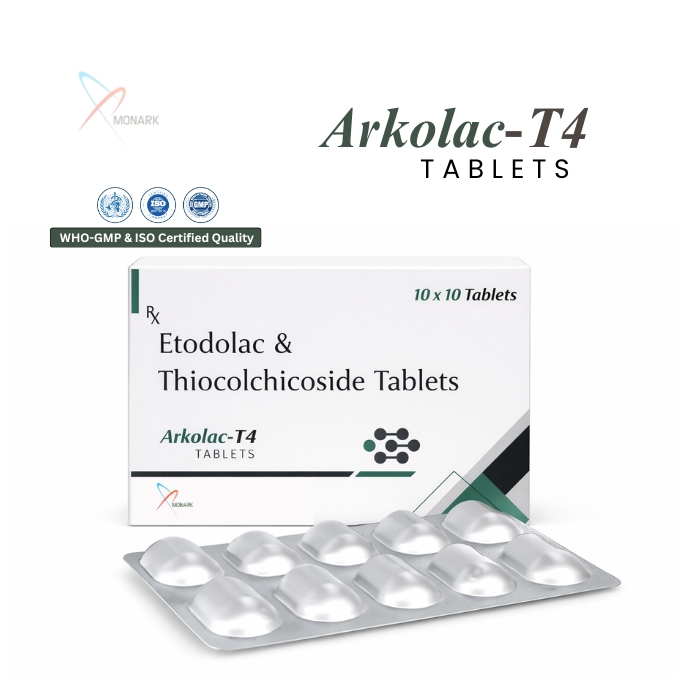 Etodolac Thiocolchicoside tablets combine two active ingredients, Etodolac and Thiocolchicoside, to provide effective relief from pain and muscle spasms associated with musculoskeletal conditions. This combination is primarily used to treat acute pain, inflammation, and stiffness caused by conditions such as osteoarthritis, rheumatoid arthritis, and back pain, providing both anti-inflammatory and muscle-relaxant effects.