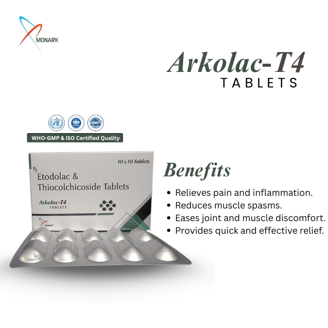 The combined action of Pharma Franchise for Etodolac and Thiocolchicoside Tablet allows these tablets to provide comprehensive relief from pain, inflammation, and muscle tension: