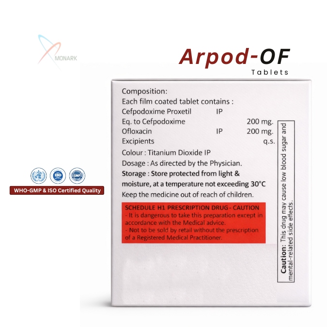 Cefpodoxime: Targets bacterial cell walls by binding to penicillin-binding proteins (PBPs), preventing peptidoglycan synthesis and leading to bacterial cell death. Ofloxacin: Inhibits bacterial DNA gyrase and topoisomerase IV, crucial enzymes for DNA replication, transcription, and repair. This prevents bacterial reproduction, leading to the elimination of the infection. By combining these two mechanisms, the tablet provides superior bacterial eradication and reduces the risk of resistance development.