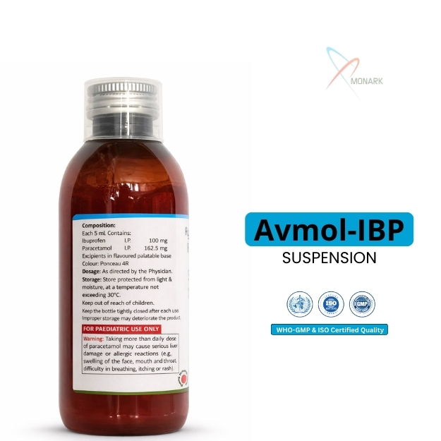 AVMOL-IBP Suspension is a dual-action pediatric formulation from Monark Biocare that provides effective relief from fever, inflammation, and body pain. Combining two trusted ingredients—Ibuprofen and Paracetamol—this suspension offers both antipyretic and anti-inflammatory benefits in one pleasant-tasting solution. With a 100ml bottle tailored for pediatric use, AVMOL-IBP is recommended by pediatricians for its fast action, superior tolerability, and high compliance among children.