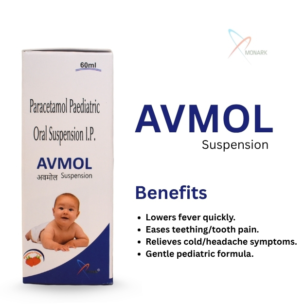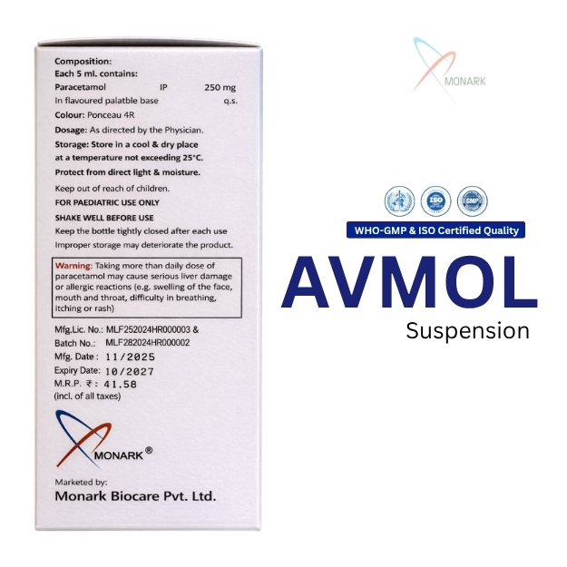 AVMOL Suspension is a trusted pediatric formulation marketed by Monark Biocare, designed for fast and effective relief from fever and mild-to-moderate pain in children. With Paracetamol as its primary active ingredient, AVMOL Suspension stands out due to its safety profile, pleasant taste, and rapid action. Monark Biocare ensures that AVMOL Suspension meets the highest standards of quality, efficacy, and compliance, making it a preferred choice among pediatricians and healthcare providers across India.