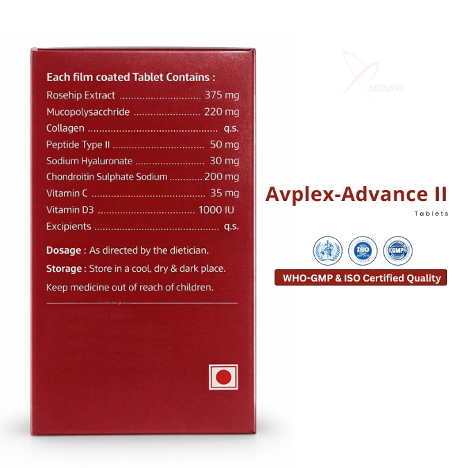 Product Composition: Rosehip Extract 375mg + Mucopolysacchride 220mg + Collagen Peptide Type II 50mg + Sodium Hualuronate 30mg + Chondroitin Sulhpate Sodium 200mg + Vitamin C 35mg + Vitamin D3 1000IU