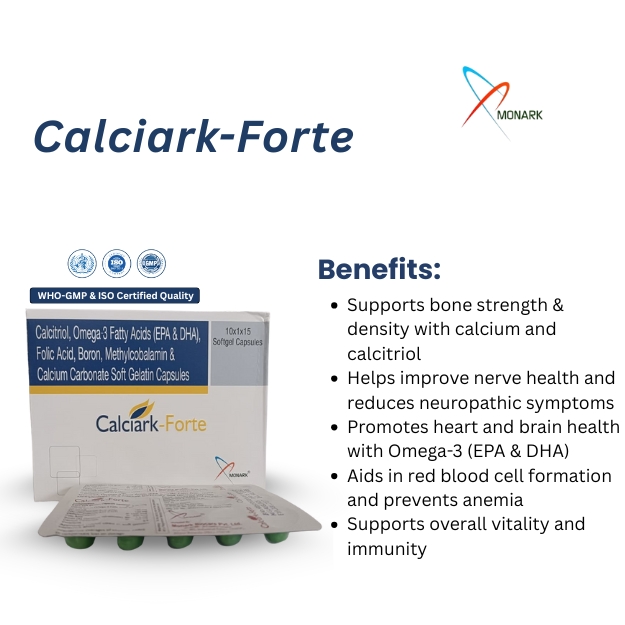 Manufactured in WHO-GMP and ISO-certified facilities, CALCIARK-FORTE undergoes rigorous quality checks to ensure purity, potency, and efficacy. The softgels are gelatin-based, free from heavy metals, and compliant with Indian regulatory standards.