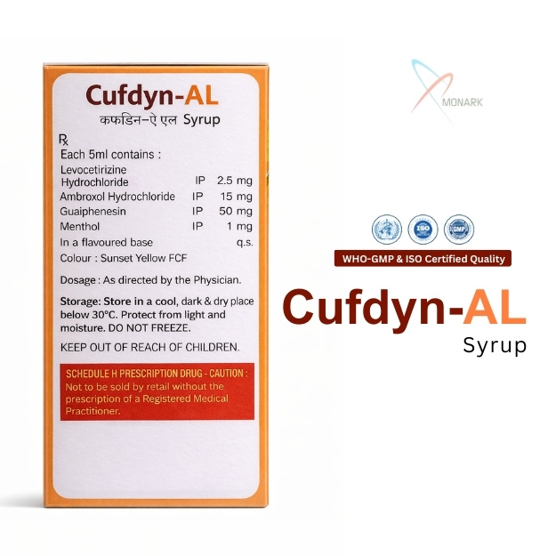 Product Composition: Levocetirizine HCL 2.5 mg + Ambroxol HCL 15mg + Guaiphenesin 50mg + Menthol 1mg Syrup with monocarton SUGAR FREE