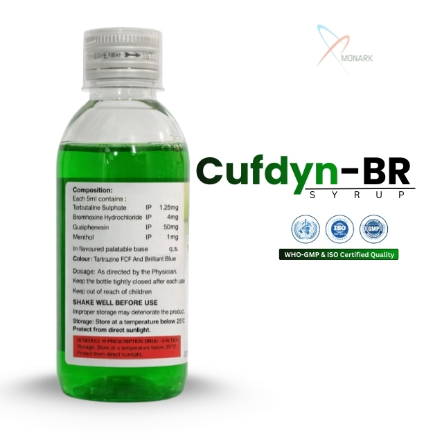 CUFDYN‑BR Syrup is a multi‑action respiratory solution combining a bronchodilator, mucolytic, expectorant, and cooling agent. Designed in a 100 ml bottle with a protective monocarton, it's meant to ease cough and congestion associated with bronchial irritation.