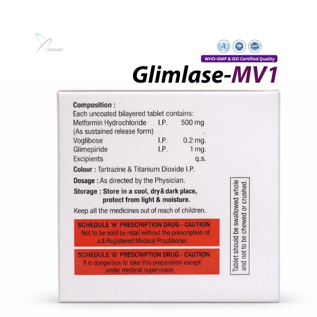 Product Composition: Metformin(SR) 500MG + Voglibos 0.2MG + Glimepiride 1MG Bilayered Tablet