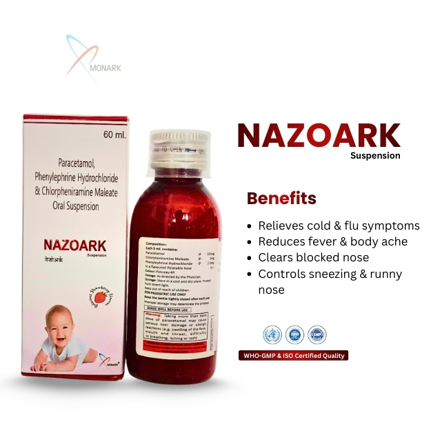 Product Composition: Paracetamol 125mg + Phenylephrine 5mg + CPM 0.5mg + Sodium citrate 60mg+ Menthol 1mg Suspension With Monocarton