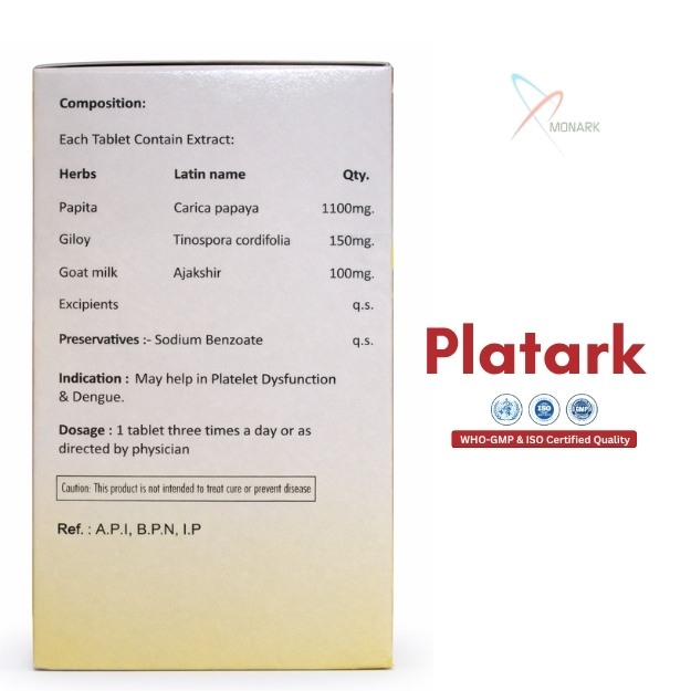 Product Composition: Carica Papaya Leaf 350 mg+ Tinospora 150 mg+ Goat Milk Powder 100 mg + Wheat Germ Oil 40 mg+ swertia chirata 125 mg Tablet (FOOD)