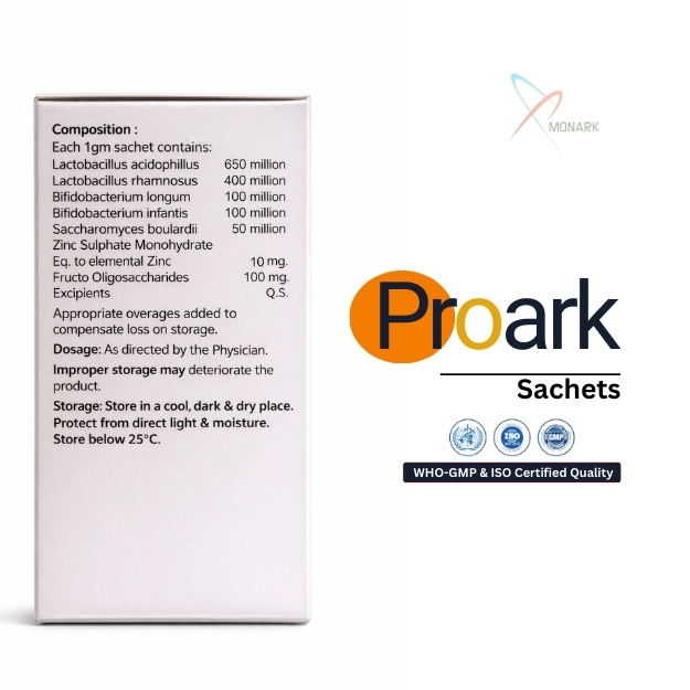 Product Composition: Bifidobacterium Longum 100.million spores + Bifidobacterium infantis 100.million spores + Lactobacillus Acidophilus 650.million spores + Lactobacillus Rhamnosus 400 million spores + Saccharomyces Boulardi 50 million + zinc sulphate 10mg + Fructo OligoSaccharides 100mg