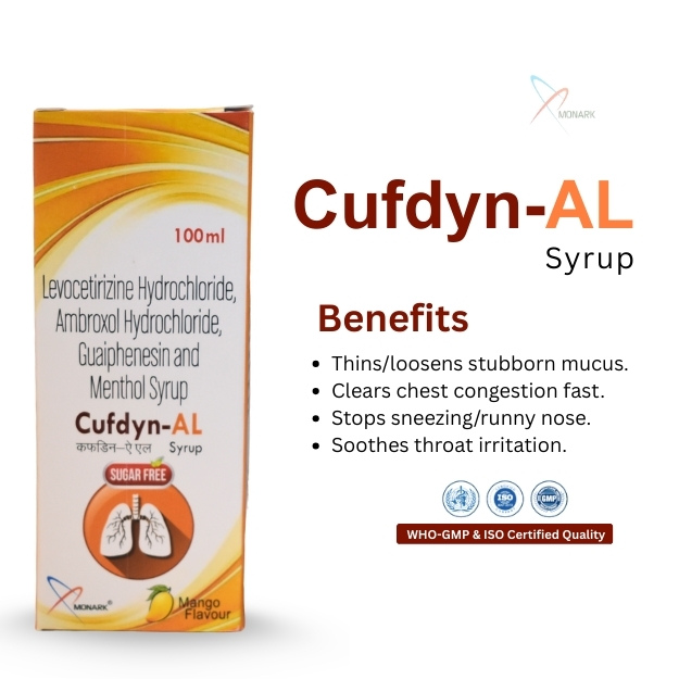 Product Composition: Levocetirizine HCL 2.5 mg + Ambroxol HCL 15mg + Guaiphenesin 50mg + Menthol 1mg Syrup with monocarton SUGAR FREE