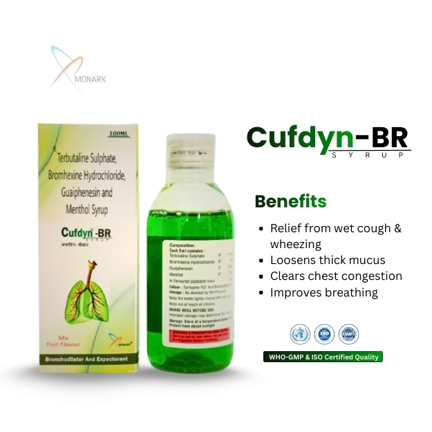 CUFDYN‑BR Syrup is a multi‑action respiratory solution combining a bronchodilator, mucolytic, expectorant, and cooling agent. Designed in a 100 ml bottle with a protective monocarton, it's meant to ease cough and congestion associated with bronchial irritation.