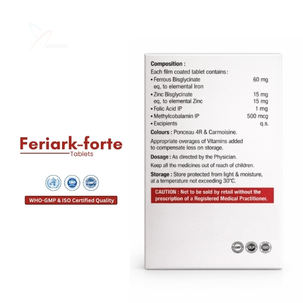 Product Composition: Ferrous Bisglycinate 60 mg + Zinc Bisglycinate 15mg + Folic acid 1mg + Methylcobalamin 500mcg Tablets