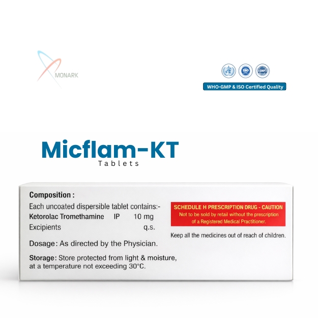 - Pain Relief: MICFLAM-KT Tablet provides effective relief from pain associated with conditions like rheumatoid arthritis, osteoarthritis, and musculoskeletal injuries. Its anti-inflammatory properties help reduce swelling and discomfort, improving mobility and quality of life for patients.